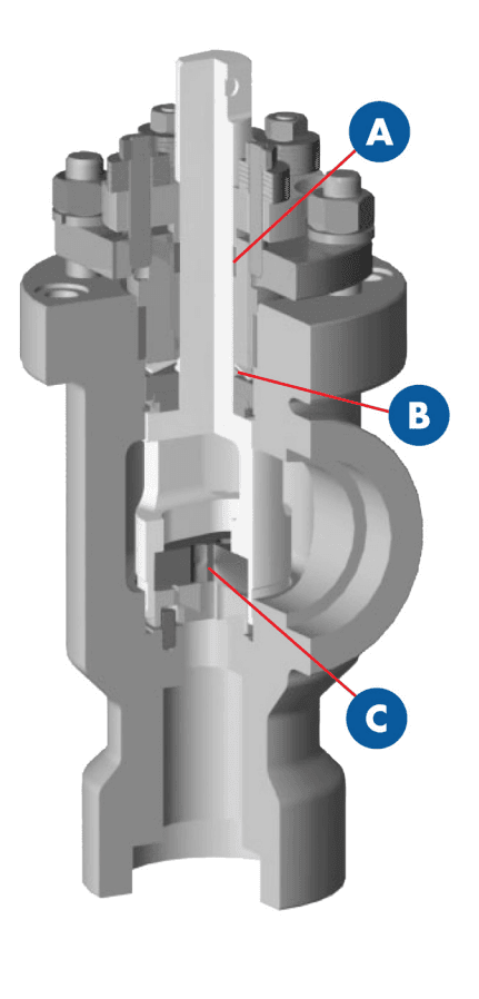 A – The stem/fork packing is isolated from the bonnet seal arrangement and is live-loaded. Belleville springs on the packing gland bolts self-adjust to maintain constant packing load regardless of thermal cycling. The design reduces the potential for packing leaks.